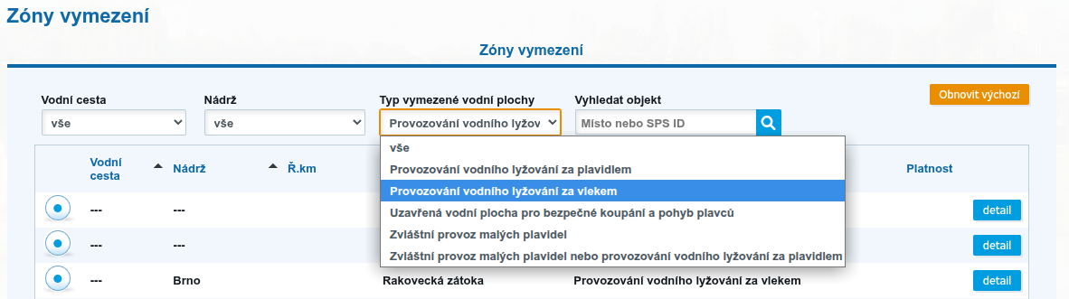 Upřesnění výběry typu vymezené vodní plochy použijte filtrování: